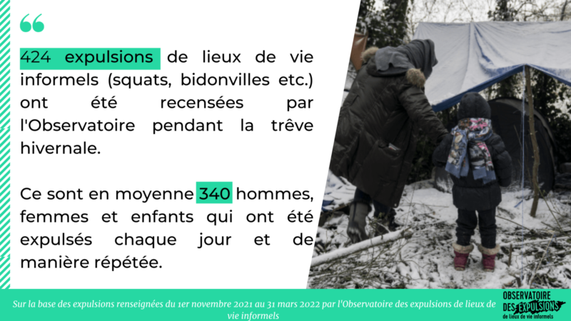 Nous espérions que la trêve hivernale offrirait un peu de répit aux personnes survivant en habitat informel : squats, bidonvilles etc. Cependant, ce sont, en moyenne 340 hommes, femmes et enfants qui ont été expulsés chaque jour et de manière répétée pour un certain nombre d’entre eux.